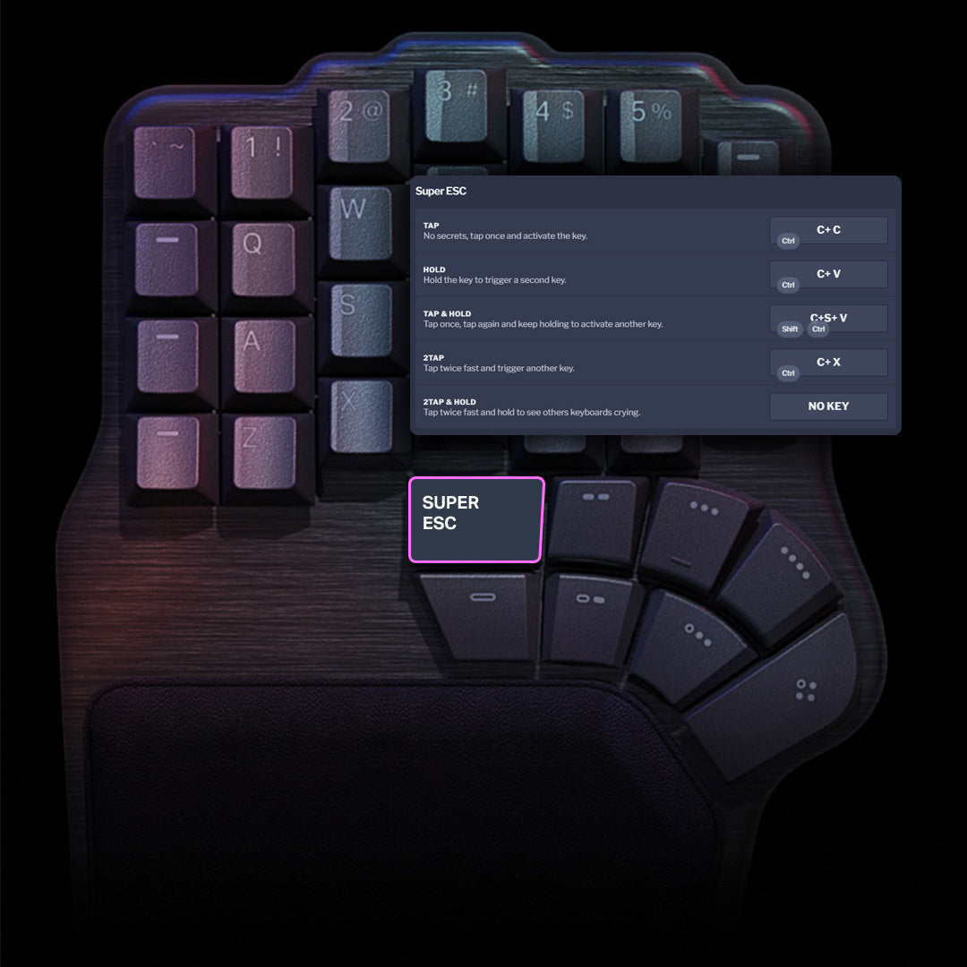 Superkeys allow up to 5 different functions in a single key. You activate each function with a tap, hold, tap and hold, double-tap or double-tap and hold.