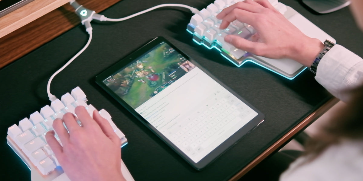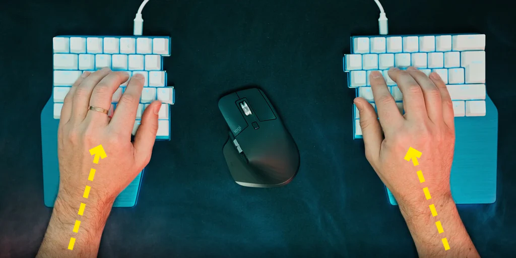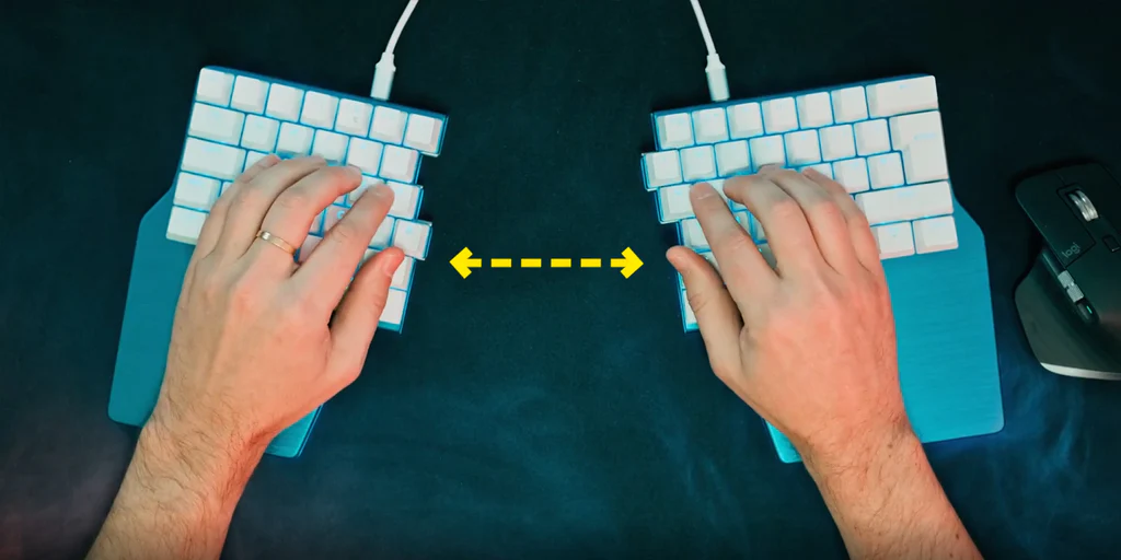 A small split makes the keyboard use a lot of desk space, pushing your mouse away. If you don’t like that, we have a solution: split both halves more, and place the mouse in the middle.