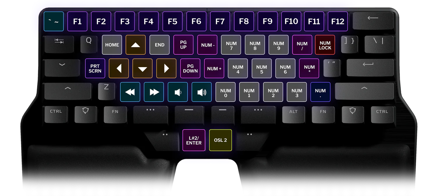 Every Raise has a preinstalled layer 2 with all the other keys present on larger keyboards: the arrows, the F keys, the number pad, and the media keys... you name it.