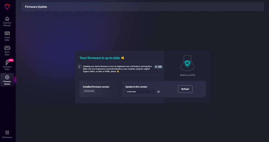 We've also added a failsafe so your layers are always restored after updating the Firmware. If the failsafe fails, we've set a warning telling you that your layers haven't been restored and that you can restore them in the preferences menu. Let's check what is in there!