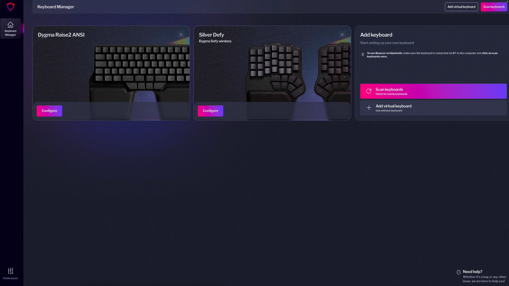 The first thing you'll notice is the new keyboard manager. Here, you'll see your connected devices. If you don't see your keyboard, press Scan Keyboards, and it will appear.