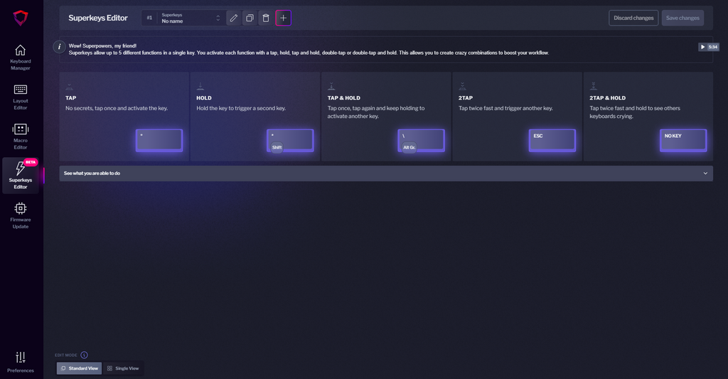Now, let's check the Superkeys Tab. Superkeys let you create keys with up to five different functions: tap, hold, tap and hold, double tap and double tap and hold.