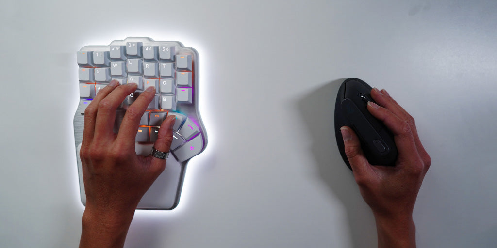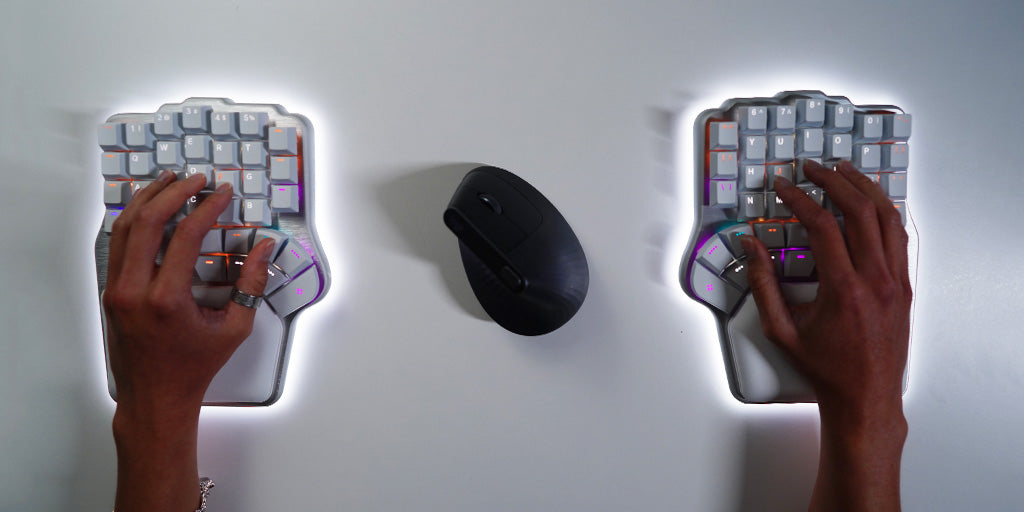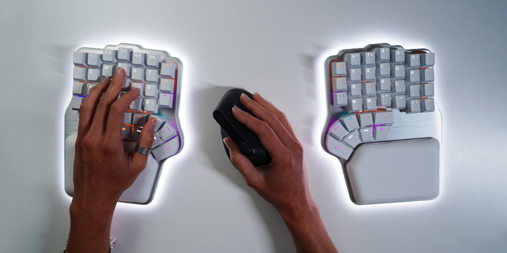 A small split makes the keyboard use a lot of desk space, pushing your mouse away. If you don’t like that, we have a solution: split both halves more, and place the mouse in the middle.