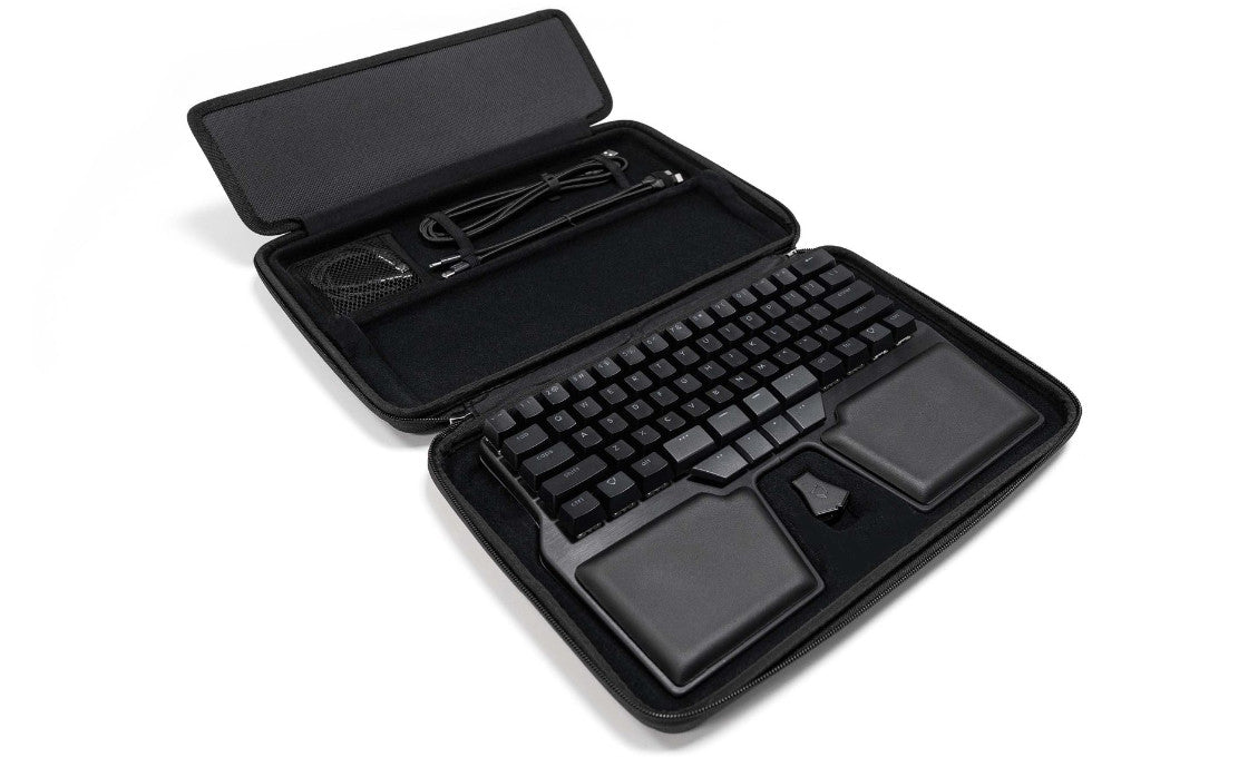 A practical travel case where you can transport the Dygma keyboards and all its cables and accessories. It can also carry the Raise with the Tenting Kit attached.